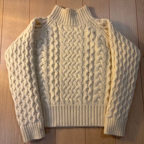 Paksu, valkoinen, käsintehty palmikkoneule. Arviolta reilua S-kokoa. Luulen, että joskus pesty melko lämpimällä vedellä, jolloin neulos hitusen tiivistynyt, mutta ei ole missään nimessä mikään huovuttunut neule. Siisti ja kaunis edelleen.