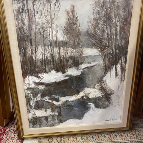 Arres Salli 1979. Arvostettu maisemamaalari. Upea teos. Öljymaalaus. Parhaalta 1970 luvun kaudelta. Hienokuntoinen ja kehykset myös. Koko 67x86 + kehykset. Nähtävissä Tapiontorilla Tapiolassa. Aarne Ervin keskustassa. Nähtävissä iltaisinkin katutason ikkunan läpi.