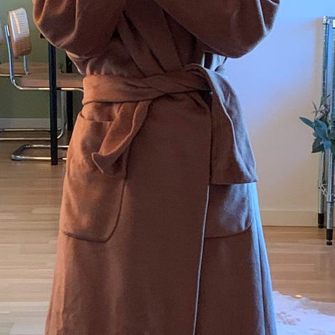 Olen kuvassa 170 cm ja käytössä koko 42-44. Takki istuu varmasti hyvin myös minua suurempaa kokoa käyttävälle.