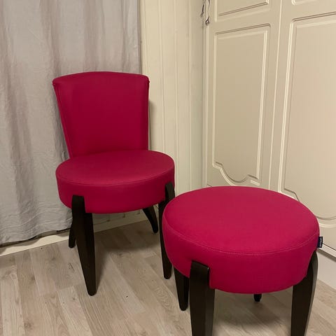 Kuvan nojatuoli ja rahi. Ehjät verhoilut, puisissa käsinojissa pieniä kolhuja/kulumaa. Kysymällä lisätietoja.