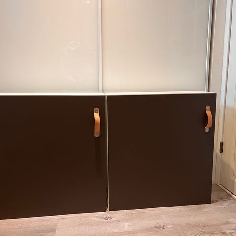 Myydään Ikea Bestå 60x38cm tammiviiluinen kaappi ruskealla ovella.