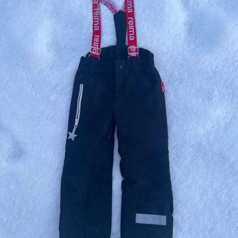 Reima lasten housut, koko 104, musta väri, unisex-malli. Housuissa on säädettävät olkaimet ja joustava vyötärö.
