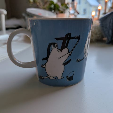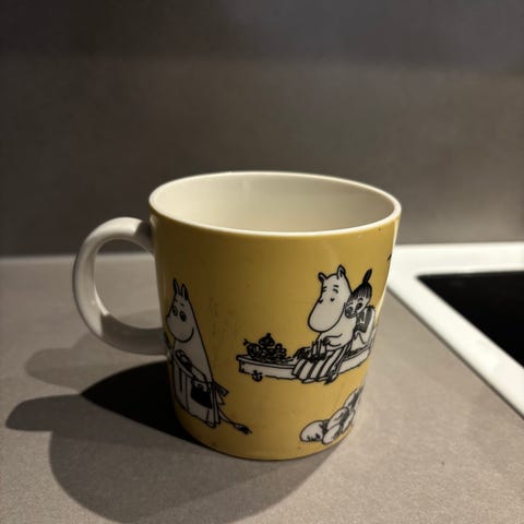 Alkuperäisessä tumman roosan värissä oleva Muumi muki, joita valmistettu vain pieni erä.