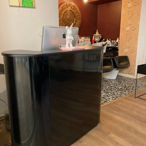Vastaanottotiski on hyväkuntoinen, ja sen pinta on päällystetty itseliimautuvalla kuviokalvolla. Kalvo irtoaa tarvittaessa helposti ja väri on tiskillä kokonaan valkoinen.
