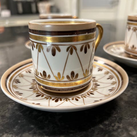Kupin korkeus n. 6 cm ja halkaisija n. 7 cm. Lautanen n. 12,5 cm.