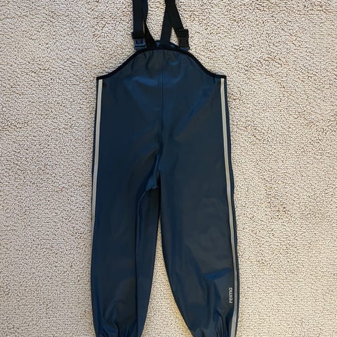 Lasten Reima kurahousut koko 116. Ehjä pinta. Heijastinnauhat sivussa. Toiselta puolelta ylhäältä vähän reunasta irronnut, tästä kuva. Sivuilla neppareilla säätövara. Henkseleiden jousto menettänyt kimmoisuutta, mutta joustaa yhä jonkin verran.