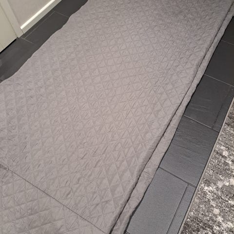 Koko 140 x 270 cm. Kaksipuoleinen tikattu kangas. Toinen puoli pääväreiltään puna-musta, toinen musta-harmaa. Kunto hyvä. Peite kuvattu levitettynä kolmen istuttavan sohvan päälle.