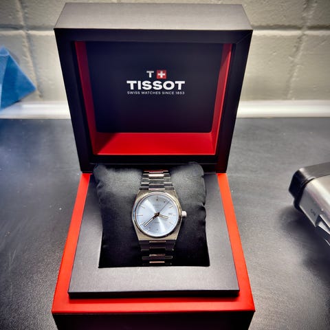 Tissot PRX 40mm Quartz. Laatikko, jatkopala ja aitoustodistus tulevat mukana. Kello on erinomaisessa kunnossa, eikä siinä ole naarmuja.