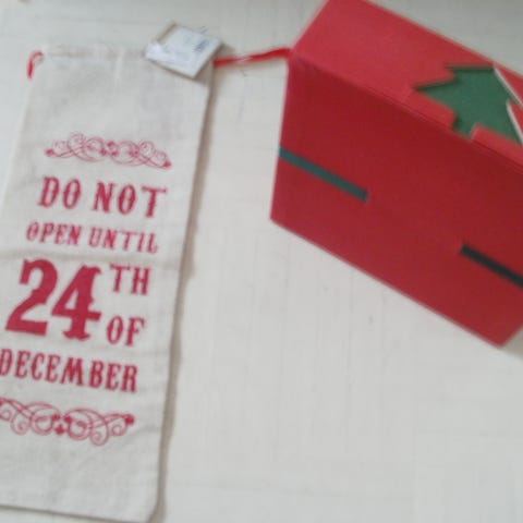 Kiva jouluinen pussukka jossa neljä lokeroa vaikka pienille paketeille, jouluglögille, nameille. Koko 44x20cm