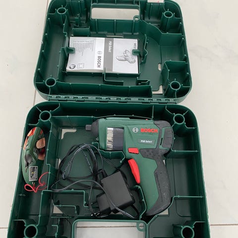 Sähköinen ladattava akkuruuvinväännin jossa 100 kärkeä ja kaksi sovitinta. Oikealle ja vasemmalle pyörivä. Einhell 6V 300mA laturi. Kaupan päälle tulee yksi vähän pidempi Boschin kärki joka sopii täydellisesti tähän työkaluun.
