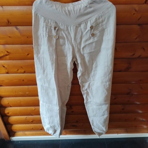 Kuvien mukaiset pellavan väriset housut, pellavahousut , joissa 55 % pellavaa ja 45% viskoosia.