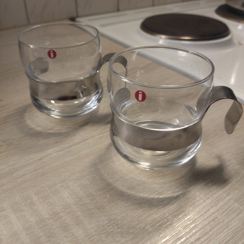 Kultaisen värisillä pidikkeillä, Paula sarjan pienet lasit. Yhden lasin korkeus noin 5,5 cm. Myydään settinä, hinta 10€.
