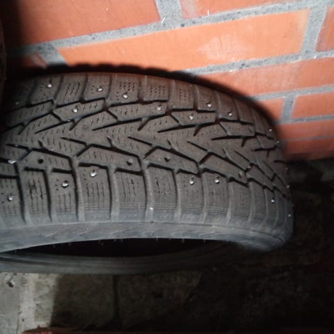 Hyväkuntoiset Nokian Hakkapeliitta 8 nastarenkaat. Äkkiseltään näyttäisi olevan kaikki nastat paikallaan.