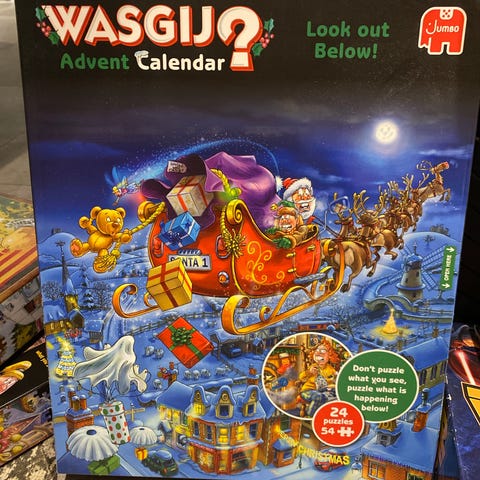 Jumbo Wasgij -palapelit, joissa on 1000 palan kokoinen palapeli. Sisältää useita eri malleja, kuten Mystery Puzzle, Original Puzzle ja Retro -teemoja. Palapelit ovat värikkäitä ja sisältävät yksityiskohtaisia kuvituksia erilaisista aiheista kuten kaupunkinäkymistä, juhlista ja historiallisista teemoista.