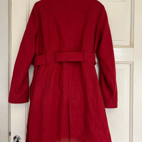 Myynnissä kuvan mukainen Suomessa valmistettu punainen villakangastakki. Materiaali 70%villaa ja 30%viskoosia. Vuori polyesteriä. Takista ei löytynyt kokoa, mutta otin mitan takin etuosasta (nappien ollessa kiinni) kainalosta-kainaloon ja se oli n. 55cm. Eräs toinen 42 kokoinen takki oli samasta kohdasta mitattuna hieman leveämpi, joten päättelin siitä kooksi 40.