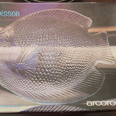 Neljä erilaista ja eri kokoista lasista kalan muotoista tarjoilulautasta. Kolme on ranskalaista Arcoroc designia. Yhden valmistaja on tuntematon.