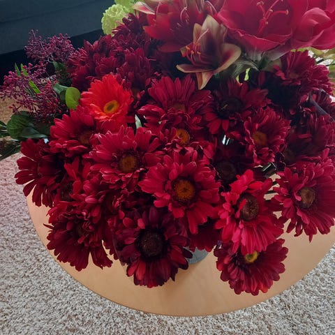 Korkealaatuiset silkkikukkakimput; ruusukimput kahta eri väriä ja hyasinttikimppu.