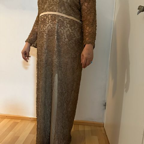 Mim Kaunis harmaa juhlamekko,mekko jossa hihat ohutta kangasta (kuultaa vähän läpi) ja hihansuissa kauniit timantti ja helmi koristelut. Mekossa on vuori.