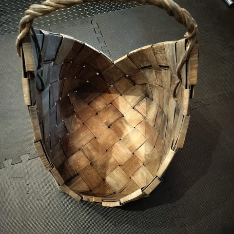 Erittäin jämäkkärakenteinen vanha pärekontti. Jopa niin jämäkkä, että kansi ei taivu kiinni helposti. Säilytetty lämpimissä sisätiloissa. Korkeus 35, leveys 32, paksuus 10 cm.