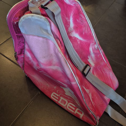 Kohtuullisessa kunnossa oleva luistelureppu. Omat lokerot luistimille, keskellä tilaa varusteille, eväille yms. Tullut käytettynä meillekin, Pohjassa oli kulumaa jo silloin. Käytimme luistimissa pehmosuojia, ettei repun pohja kulu enempää.