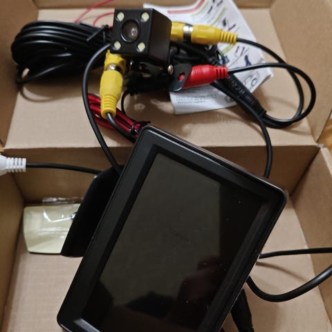 Kojelautaan asernnetava näyttö ja perään asennettava kamera sekä tarvittavat johdot.