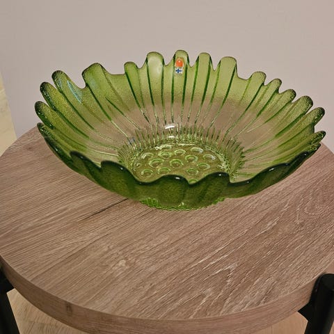 Myydään vihreä Humppilan lasin Tokka-kulho Kalevala sarjasta. Tauno Wirkkalan suunnittelema ja pohjassa on signeeraus.