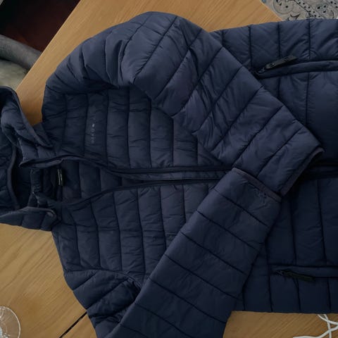 Myynnissä kuvan miesten XS-kokoa oleva tummansininen kevyttoppis. Vastaa kokoa 164cm. Ihanan pehmeä ja kevyt. Hajuton ja muutoin hienossa kunnossa, mutta selkäpuolella päällikangas on saanut pientä osumaa (viimeinen kuva).