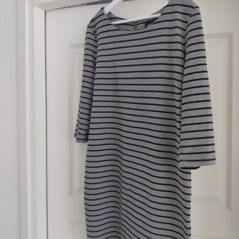 Muutamia kertoja pidetty, tummanharmaa/valkoraidallinen mekko/tunika.