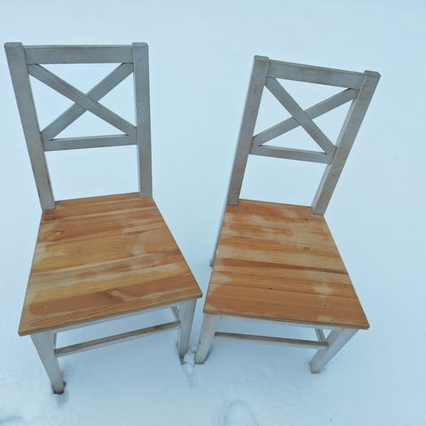 Musta maali ja istuinosa tiikkiä. Tuolit vaativat liimaamista,että tulee tukevat.