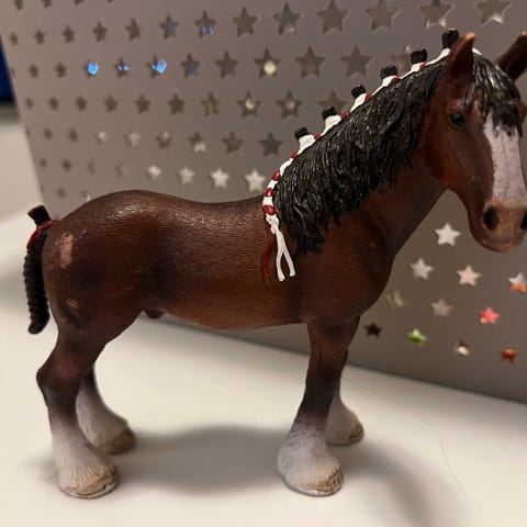 Schleich Hevonen lelu, väriltään valkoinen ja ruskea. Valmistettu kestävästä muovista. Soveltuu lasten leikkeihin ja keräilyyn.