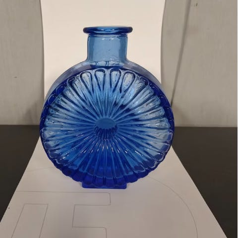 Upea, hienokuntoinen 17,5 cm korkea 2/4 aurinkopullo. Muottiin kiinnipuhallettu värillinen lasi.