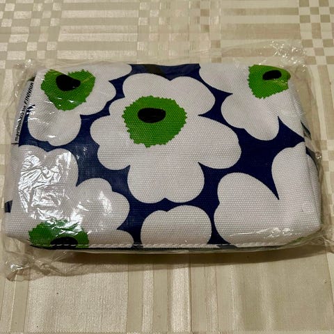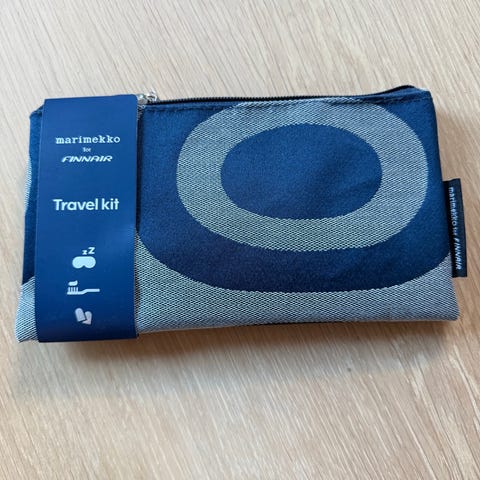 Uusi, käyttämätön Marimekko for Finnair pussukka. Pussukasta on otettu sisältä pois korvatulpat, muuten koskematon ja sisältää samankuvioiset silmälaput, sekä hammasharjapaketin.