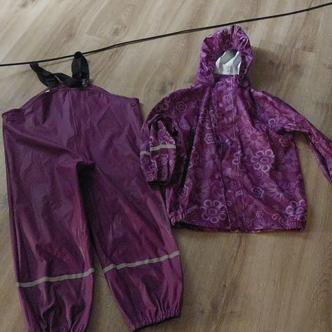 Sadehousut suorilla lahkeilla, ei lenkkejä lahkeensuissa. Polven pieni reikä korjattu sadevaatteiden korjaukseen tarkoitetulla tarralla.