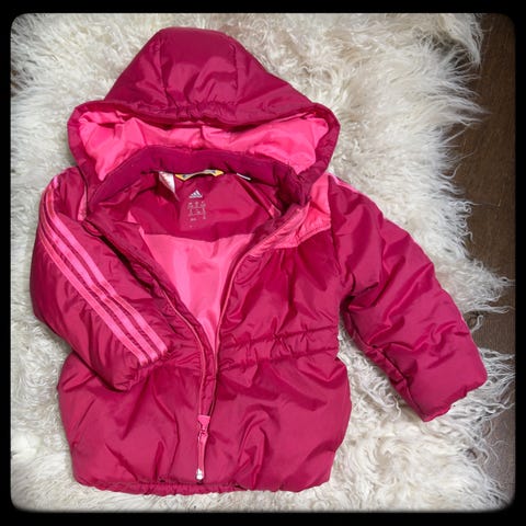 Adidas lasten takki, koko 92, punainen väri, unisex-malli. Takissa on vetoketju ja Adidas-logo edessä. Materiaali ja muut tekniset tiedot löytyvät tuotteen pesuohjetikusta.