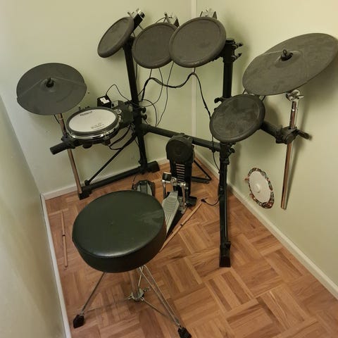 Roland TD6V sähkörumpusetti. Setissä on mukana myös Simmons DA200S vahvistin. Mukana Pearlin P121W tuplabasari (toinen pedaali P120P).