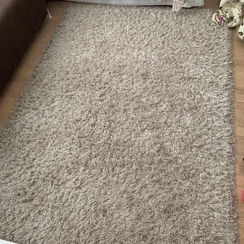 Rustasta 2-3 vuotta sitten ostettu beige Elin-matto. Matto pesty tekstiilipesurilla kesällä.