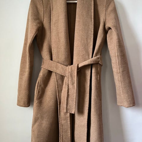 Ihana Massimo Dutti, sinapinkeltainen villakangastakki koossa 36. Päällinen 75% villaa ja 30% polyesteriä.