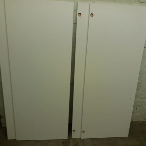 Kaksi kpl kaapin ovia, kiinnitysreiät ja läpiporattu kahvan reiät. Etupuolet siistit. Väri musta, puunsyykuvio.