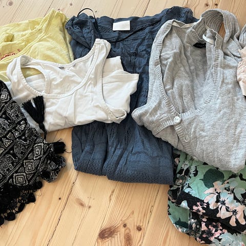 Annetaan, mieluiten kaikki kerralla! Vaatteet kokoa XS: kolme toppia ja housut, neulepanta sekä hiusten hoitoaine