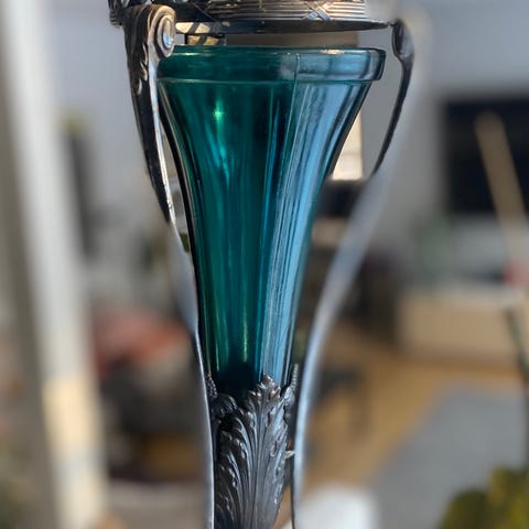 Vanha ja kaunis art deco lasimalja. Vihreä lasi on puhallettu pulleaksi metallisäikeiden väleihin. Jalka rautaa. Kauniit sinistä lasia olevat koristeet. Upeat värit! Korkeus 29cm, leveys 13cm. Täysin ehjä. Nouto/ postitus. Pk:t ostajalle. Mobilpay.
