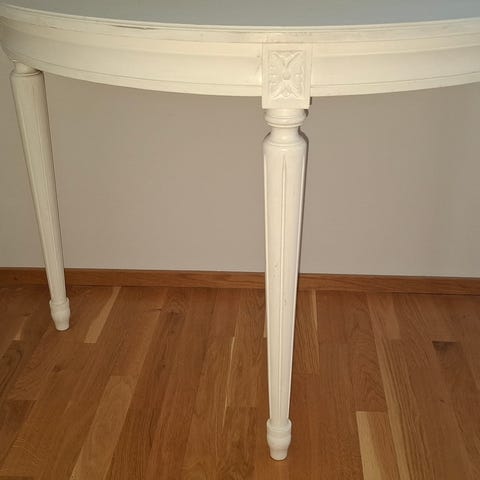 Yksi kappale puolipyöreä pöytä. Leveys 120 cm, syvyys 60 cm ja korkeus 63 cm.