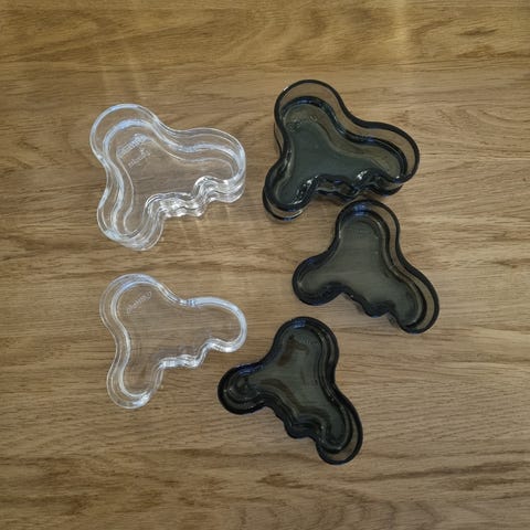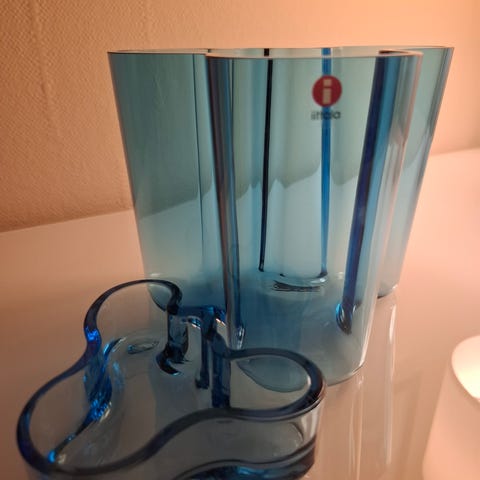 Myydään Alvar Aallon suunnittelema tarjoilusetti esimerkiksi glögikutsuille. Kaksi aaltomaljaa, kirkas ja harmaa, koko 30×98. Mukana kaksi pientä lusikkaa.