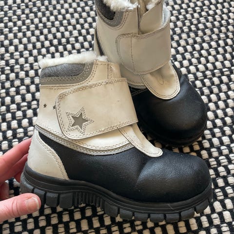 Käytettyjä hyväkuntoisia lasten talvinilkkureita. Siniset Viking Goretexit 29, keskellä Jonathan merkkiset vedenpitävät nilkkurit 30 ja keltaiset Reimat 30/31.