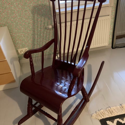 Perinteinen puinen keinutuoli ruskealla viimeistelyllä. Tuolissa on selkeä selkänojan muotoilu ja kaarevat keinukahvat. Sopii istumiseen ja rentoutumiseen erilaisissa sisätiloissa.