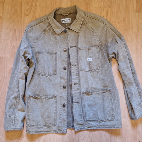 Universal Works baker's jacket, aika lailla sama kuin chore coat, mutta vähän siistimmän näköinen ja enemmän taskuja. 100% puuvillaa, paitsi hihoissa sisällä pienet polyesterivuoraukset pukemisen helpottamiseksi (näistä toinen vähän revennyt, mutta ei haittaa käyttöä). Vaalea oliivinvihreä. Neljä taskua ulkopuolella ja kaksi sisäpuolella. Kyljissä paneelirakenne parantamassa istuvuutta ja liikkuvuutta.