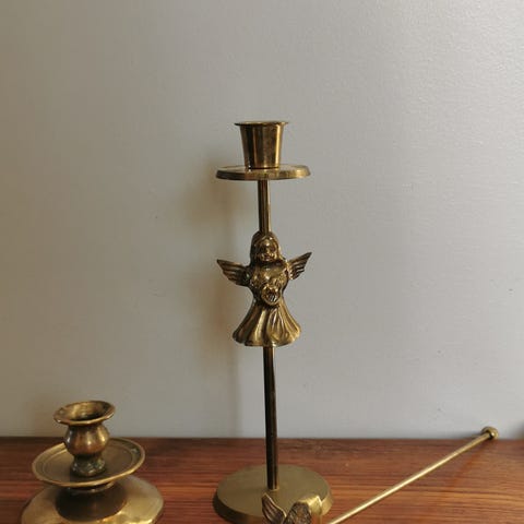 Seinälle kiinnitettävät kyntteliköt, messinkiä. Jonkin verran messingille ominaista patinaa.