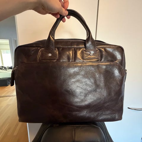 Laukussa useita taskuja ja lokeroita. Laukussa pieniä käytön jälkiä, mutta hyvässä kunnossa ja vetoketjut yms. toimii. Materiaalina aito nahka, joten kestää isältä pojalle, kunhan muistaa vähän hoitaa.
