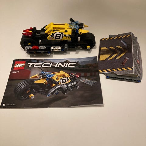 LEGO Technic moottoripyörä 8838 rakennussarja, jossa on musta ja keltainen väritys. Rakennussarja sisältää ohjeet ja osat moottoripyörän kokoamiseen. Sopii LEGO-keräilijöille ja rakentamisesta kiinnostuneille. Lokasuoja nivelkappaleen toinen vastapuoliosa sekä kumirenkaat puuttuvat