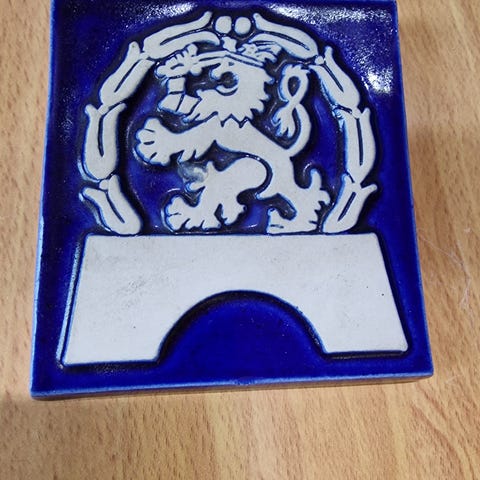 Arabia Sinivalkoinen Leijona keramiikkalaatta, koko noin 10x10 cm. Laatta on sinivalkoinen ja siinä on suomalainen leijonakuosi. Takana koukku ripustamista varten. Materiaali keramiikka.