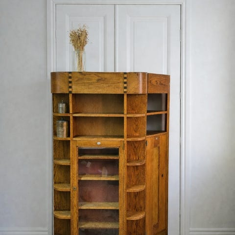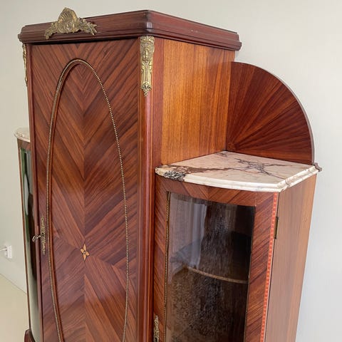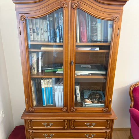 Puinen vitriinikaappi koristekaiverruksilla